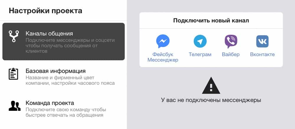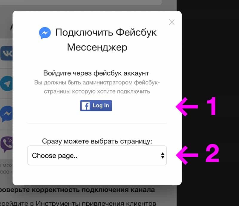 Натисніть на один з месенджерів, щоб підключити свої публічні сторінки Facebook і Вконтакте або боти Telegram і Viber .