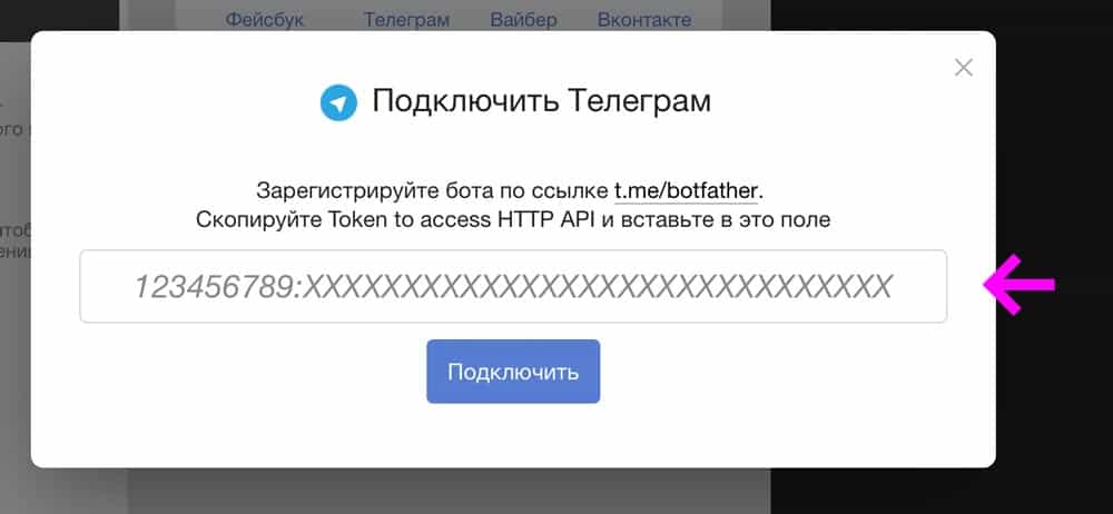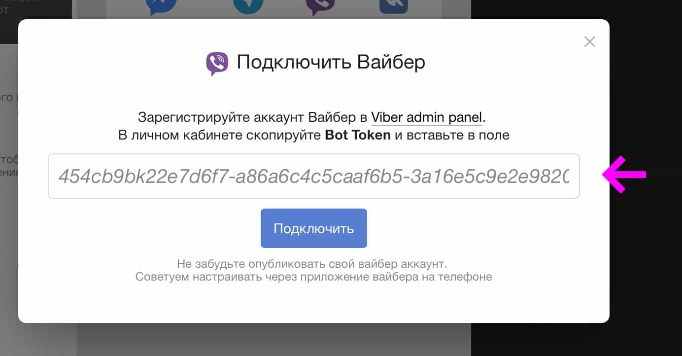 - Скопіюйте довгий ключ (token) і вставте в поле Підключити Вайбер (Налаштування проекту → Канали спілкування → Вайбер) , але не натискайте кнопку «Підключити» .
