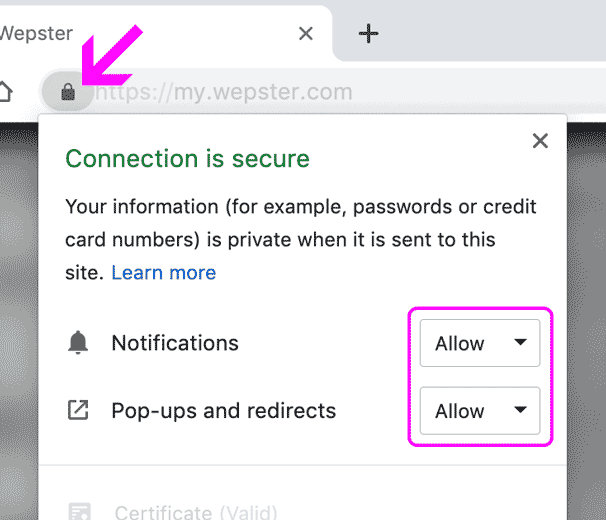 Щоб увімкнути сповіщення у браузері, натисніть на значок "Замка" в адресному рядку браузера, і встановіть "Дозволити" для сповіщень та спливаючих вікон.