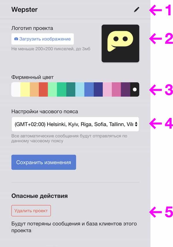 Назва проекту, часовий пояс, фоновий колір, видалення проекту